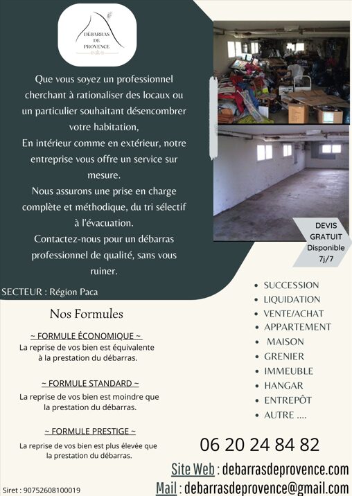 La création de Débarras de Provence part de notre volonté de contribuer au bien-être commun. Depuis nos débuts, nous sommes devenus une référence dans notre art. Vous souhaitez faire appel à nos prestations, nous intervenons dans toute la région Paca et en Occitanie. Notre équipe intervient pour effectuer un débarras complet ou partiel de vos locaux. La situation est urgente, notre équipe spécialisée est également capable d’effectuer une intervention rapide. Votre temps est précieux, le nôtre aussi. Chez Débarras de Provence, nous vous assurons d’un service de qualité pour le désencombrement de votre bien. L’enlèvement de meubles et encombrants en tous genres.
